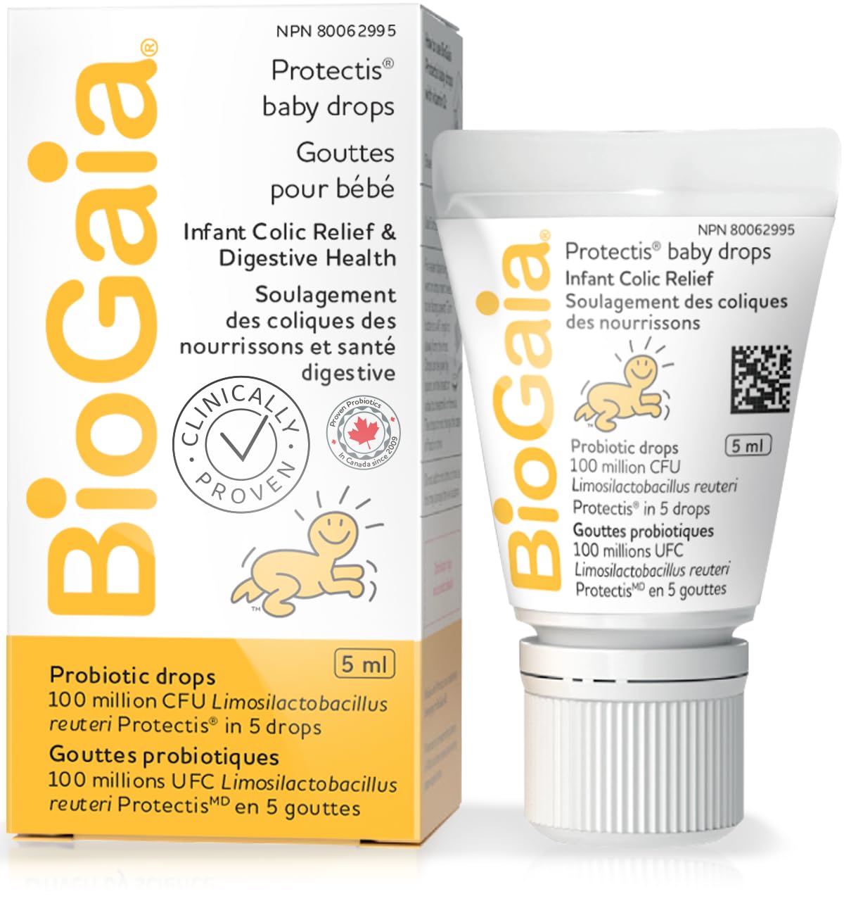 BioGaia ProTectis Drops help prevent & reduce crying episodes from colic Diminishes the frequency of regurgitation Eases ocassional constipation Helps prevent episodes of infectious diarrhea Reduces the duration of infectious diarrhea Improves and maintains digestive health Just 5 drops daily contains 100 million of Lactobacillus reuteri Protectis a unique probiotic strain that naturally colonizes the digestive tract with a proven safety profile. “Product information is provided by the product vendor. This content is a summary for informational purposes only and does not have all possible information about this product. It should not be used as a substitute for advice from health care professionals, as this information alone does not assure that this product is safe, effective, or appropriate for you. For more detailed information on this product, including reported and possible side effects and contraindications, refer to the manufacturer’s monograph, or speak with a health care provider.