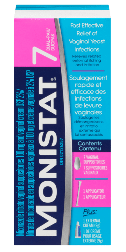 Monistat 7 Dual-Pak. It is combination of miconazole nitrate vaginal suppositories 100 mg and vaginal cream USP 2%. Monistat 7 dual-pak relieves internal and external vaginal itching, burning and white discharge due to vaginal yeast infections.